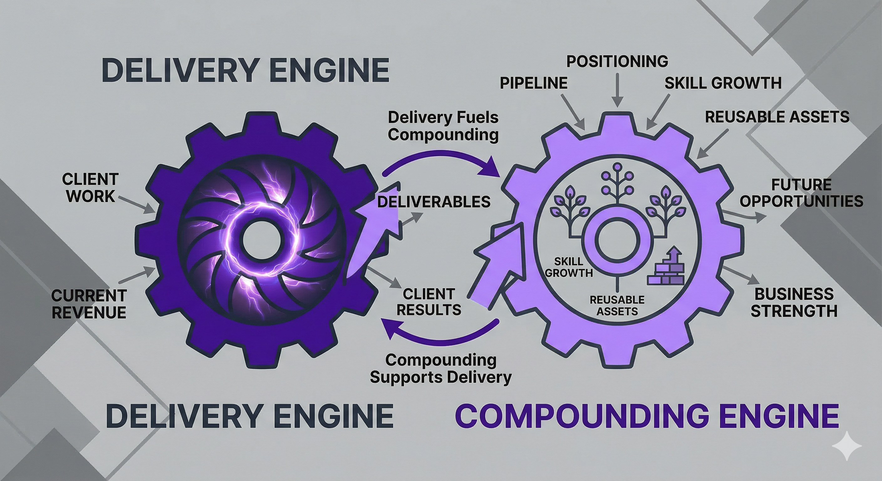 The compounding engine (pipeline, positioning, reusable assets, skill growth, relationships, leverage)