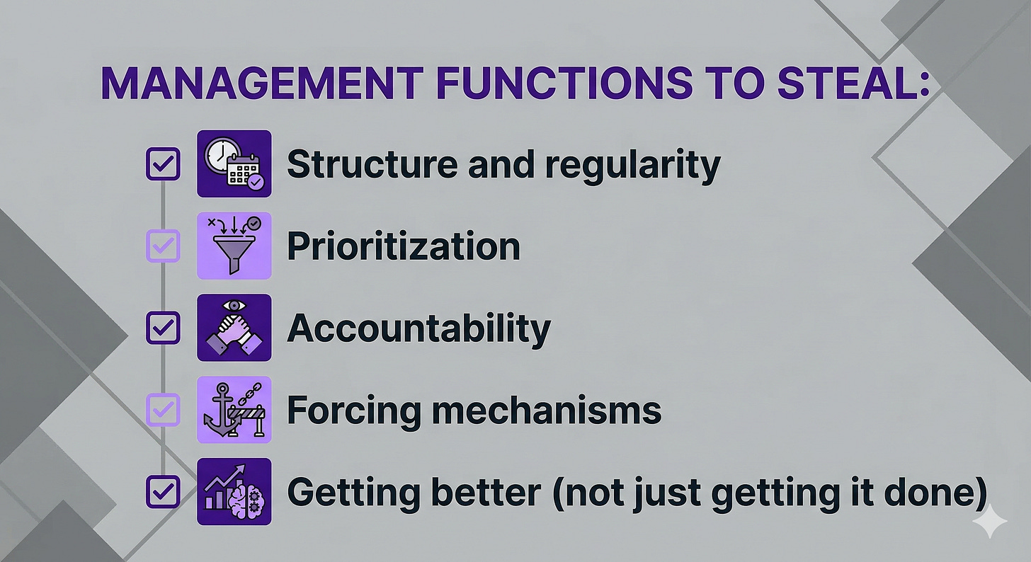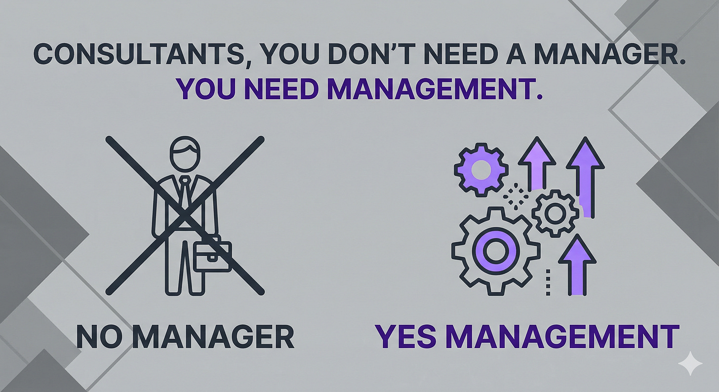 Consulting sells autonomy, but it quietly takes away something many of us depended on: a shared container for getting better. Strong management does a few unglamorous things extremely well: it creates rhythm, makes progress strategic and visible, keeps you growing, and forces the important work to happen before it becomes a crisis.