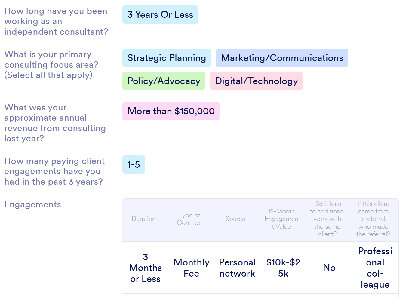 We aren't ready to release the report yet. But the early findings reveal many independent consultants are building thriving practices exceeding $150,000 in annual revenue with fewer than 4 client engagements per year on average. We're also learning about how they're sourcing their clients, and how some consultants are securing engagements valued at over $50,000 through specific relationship-building strategies.