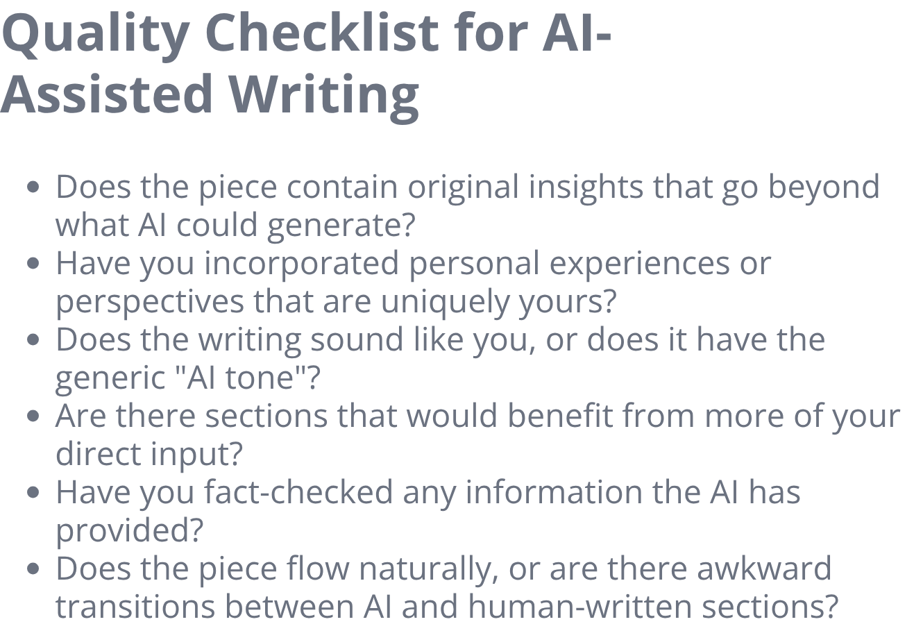 I always edit to eliminate language that sounds too polished or inauthentic. I've noticed this is one of the most common changes I'll make. AI assistants default to the median and try to please everyone, so their first draft usually sounds like a caricature of a diplomat with a degree in marketing. I want some sharp points and rough edges!