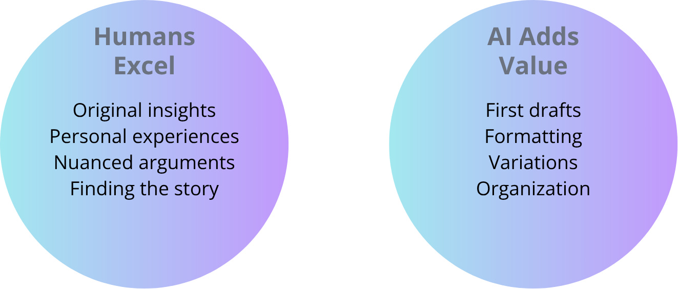 I use AI for first drafts, formatting, organizing information, and generating variations. This approach saves me time without sacrificing what makes my work valuable.