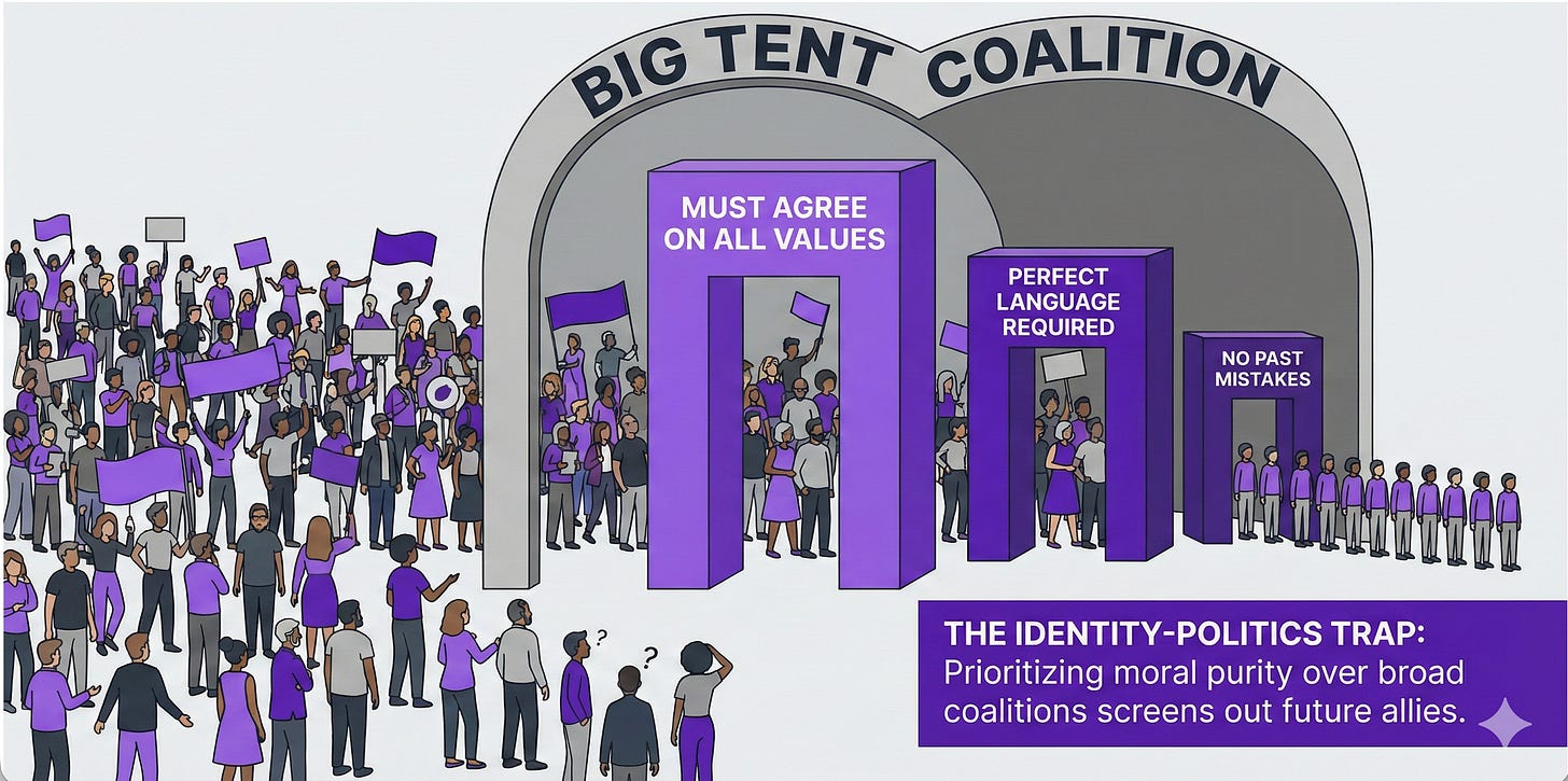 Here’s the strongest counterpoint I can offer: Identity isn’t just a vibe; it’s lived experience. Movements that ignore identity reproduce harm. “Big tent” politics can become a cover for telling marginalized people to swallow injustice for the sake of unity. Sometimes exclusion is rational: you don’t want your movement captured by people who oppose your basic dignity. You don’t want “diversity of opinion” to mean “welcome the folks who want you gone.”