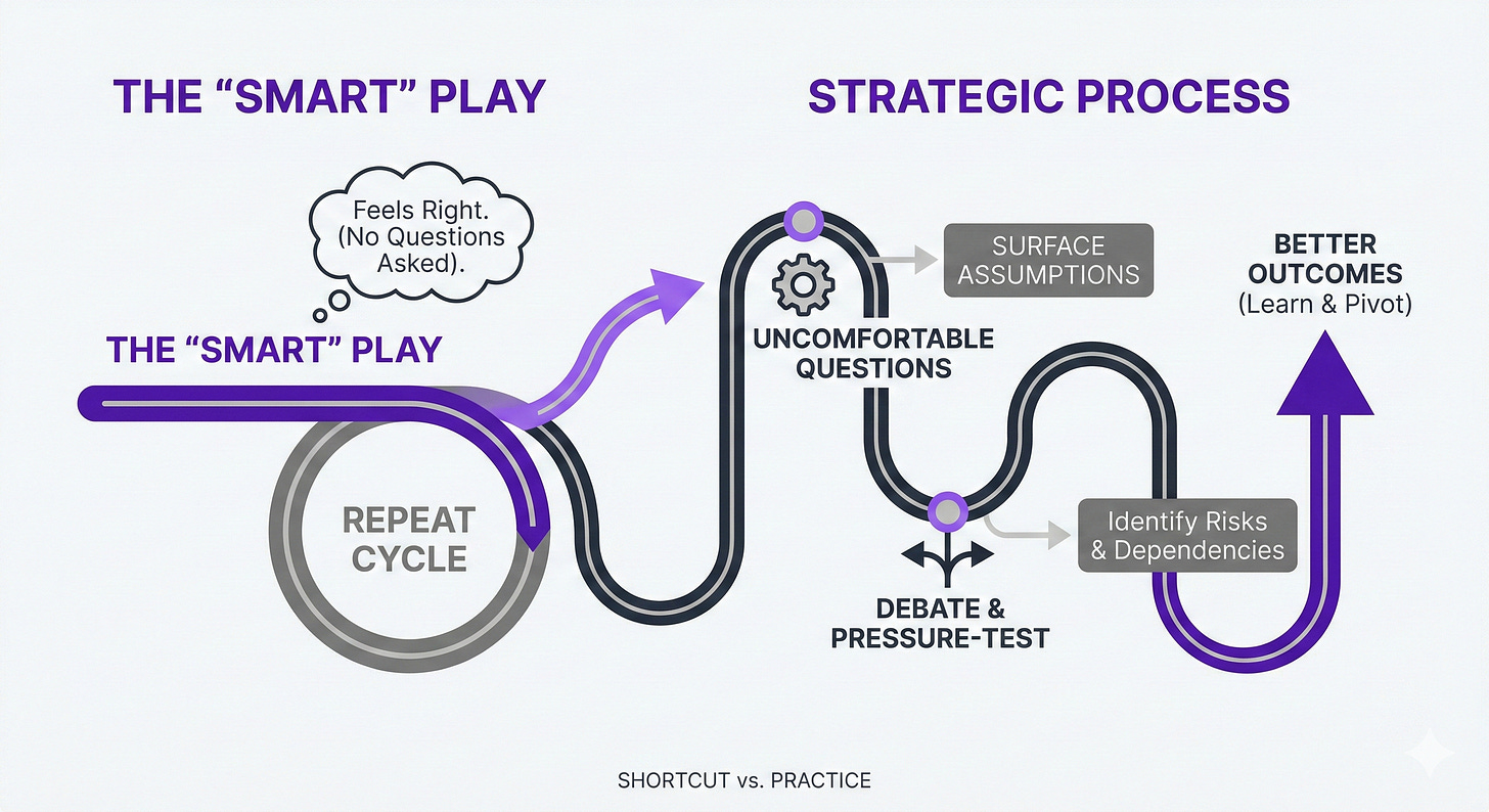No criteria for what makes a choice strategic—so “smart” filled the void. No protocol for how decisions of this magnitude get made—so the first confident voice won. No norm for pressure-testing—so agreement was the path of least resistance. No protected time for strategic thinking—so it got crammed into 4pm on a Friday when everyone was already depleted. No separation between proposing and deciding—so the Big Boss did both in one sentence. No practice at this—so the team didn’t have the muscle to engage even if they wanted to. No learning loop connecting past decisions to outcomes—so nine months later, the same pattern will repeat.