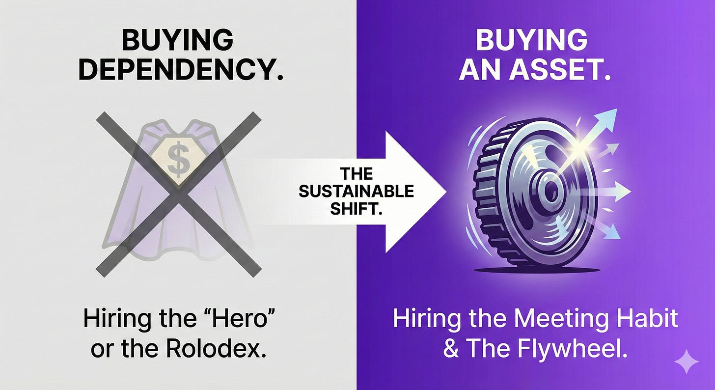 In fundraising terms: don’t hire the Rolodex. Hire the flywheel.
