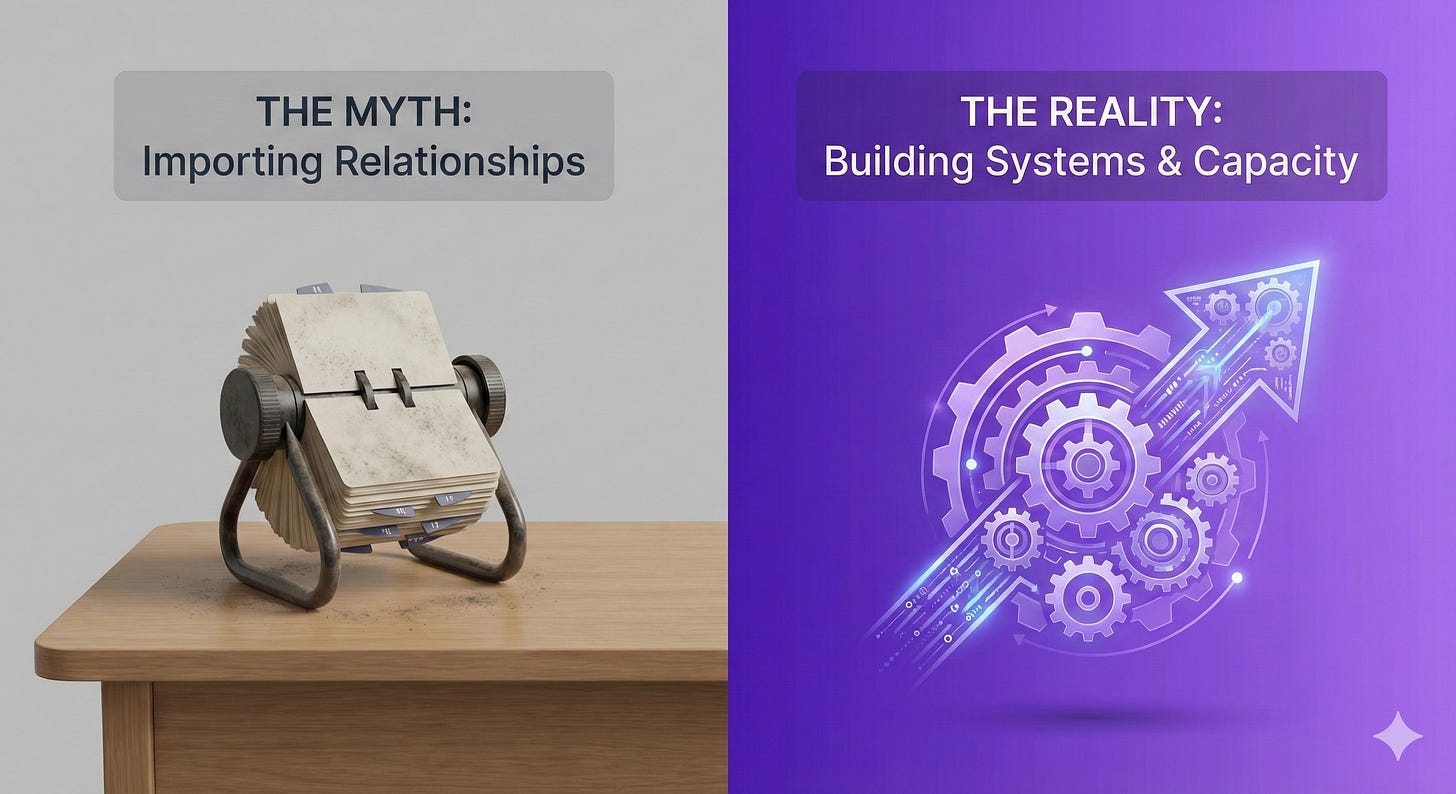 Sometimes a consultant can do pieces of that work. But if the core relationships live outside the organization, you don’t have a system – you have a dependency.