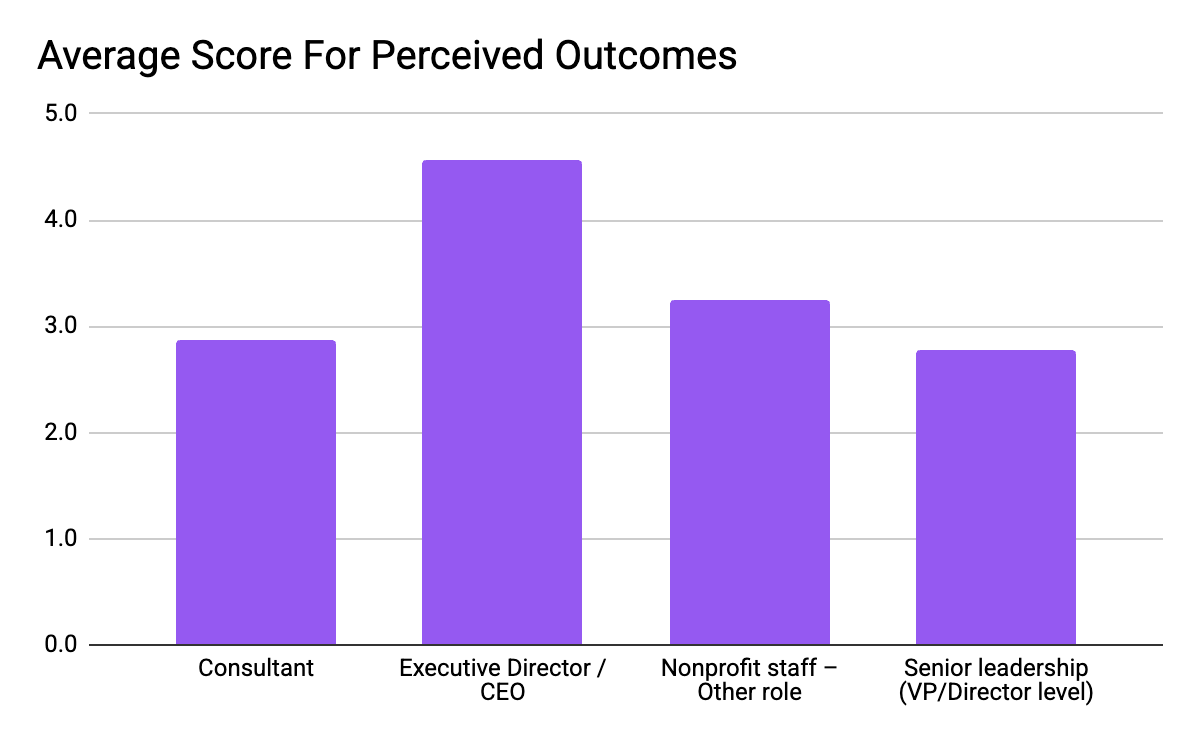 The behavioral composite tells the same story. EDs rated their organizations at 4.29 out of 5 on strategic behaviors. Senior leaders: 3.03. Consultants: 2.77. On perceived outcomes (the section that asks whether strategy actually produces results people can feel), EDs said 4.56, senior leaders said 2.77, and consultants said 2.88.