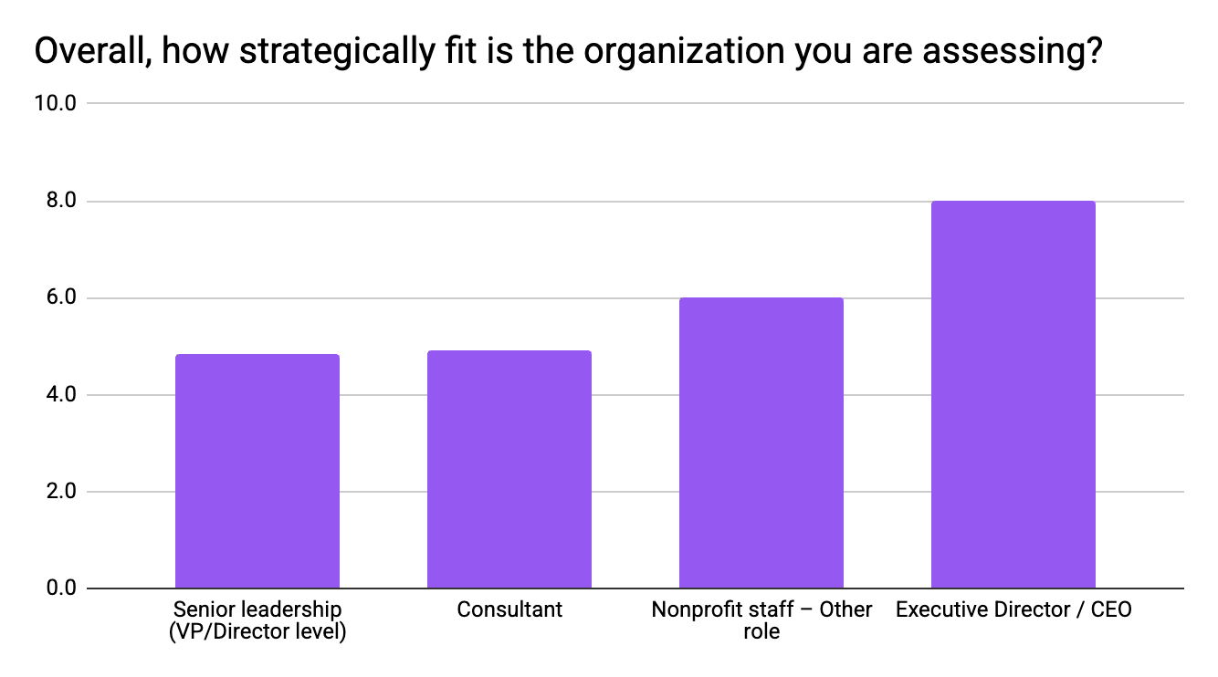 That’s the gap (on a ten-point scale) between how Executive Directors and CEOs rate their organization’s strategic fitness and how everyone else does. EDs gave themselves an average of 8.0 out of 10. Senior leaders one rung below them said 4.83. Consultants who advise these same organizations said 4.91.