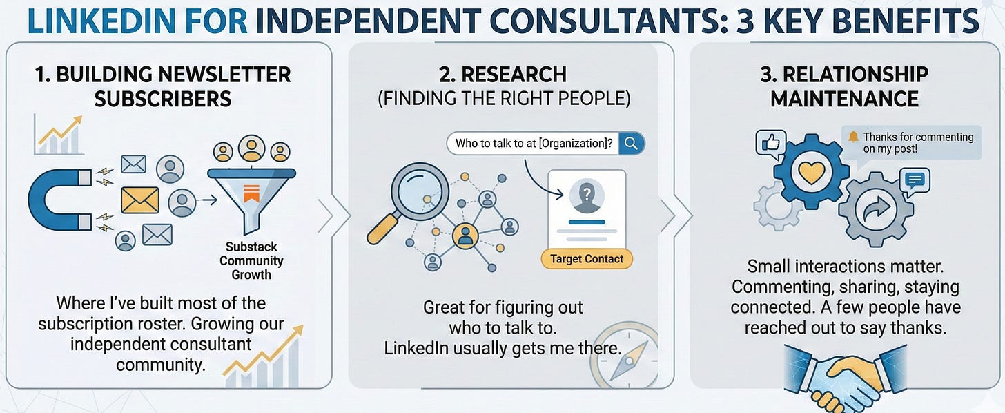 I’ve been spending a lot of time on LinkedIn since starting this newsletter. It just happened as I tried to figure out how to grow our community of independent consultants and the readership for this Substack.